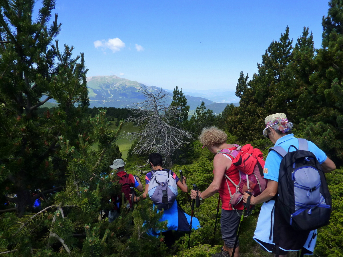 Després d´un bon esmorzar en el coll de Puig Moscos reprenem la caminada encara ens queda una bona estones de passar calor , ara el camí es més suau ,passem per al Coll Lliens aquí gaudim d´unes vistes de tota la serralada de Vallter amb els seus cims aprofitem per fer-nos unes fotos en una d´elles com de costum totes las sras del grup que avui era forçàs darrera seu una bona vista